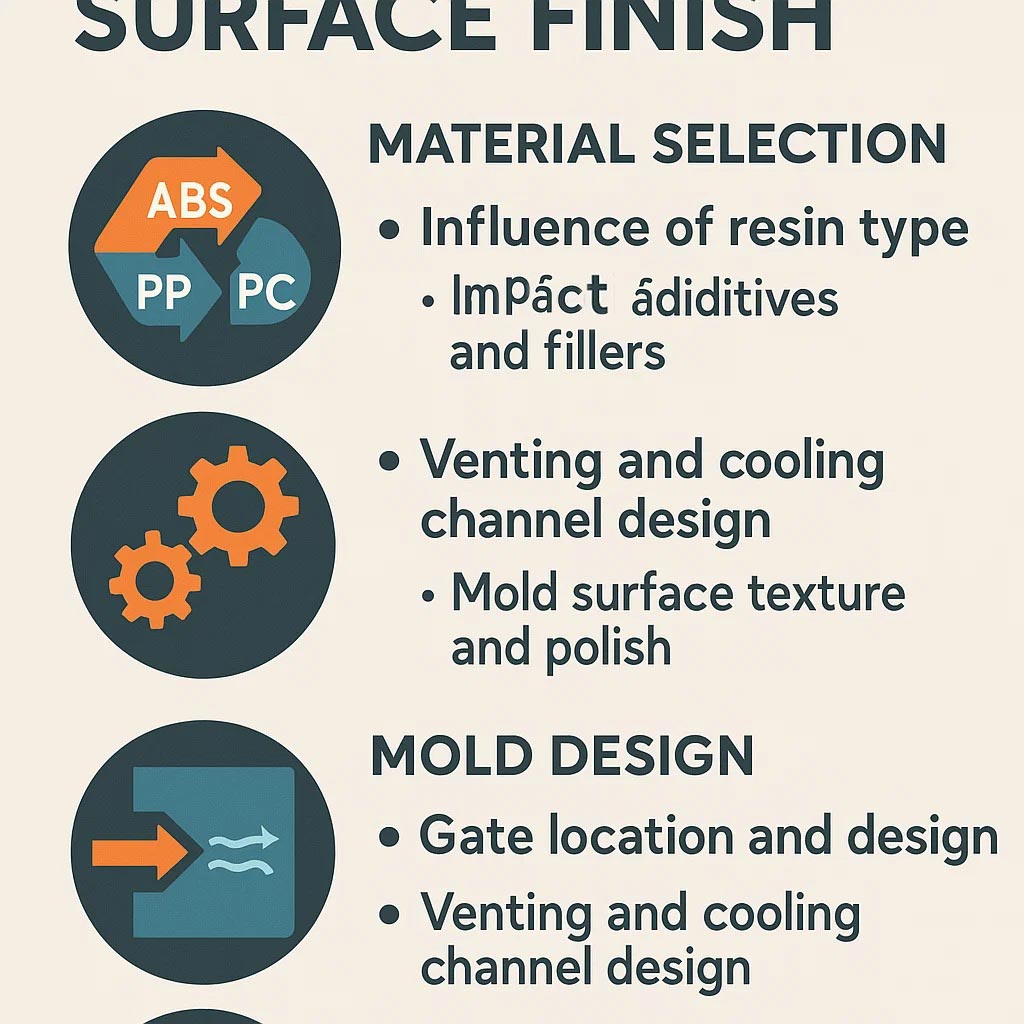 - Точность инструмента: mold dictates the maximum achievable finish. Investing in appropriate полировка пресс-формы (к конкретному R а ценность или Класс SPI ) или применяя высокоточные текстурирование поверхности (химический или лазерный) имеет важное значение. Правильный вентиляция и uniform конструкция охлаждающего канала не подлежат обсуждению для предотвращения дефектов.