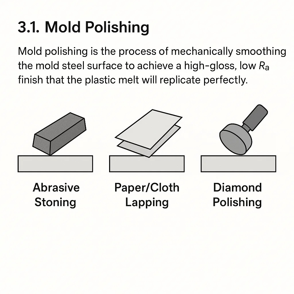 Полировка пресс-формы — это процесс механического сглаживания поверхности стали пресс-формы для достижения зеркального блеска и низкого R. a закончить так, чтобы расплав пластика идеально воспроизводился.