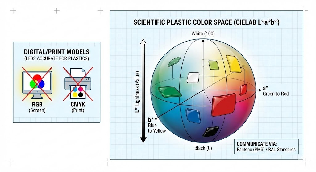 Прежде чем погрузиться в механизмы, очень важно понять, как работает цвет в физической трехмерной среде, такой как пластик. Многие ошибки проектирования возникают из-за того, что заинтересованные стороны полагаются на цифровые цветовые модели, которые плохо переносятся на физическое производство.