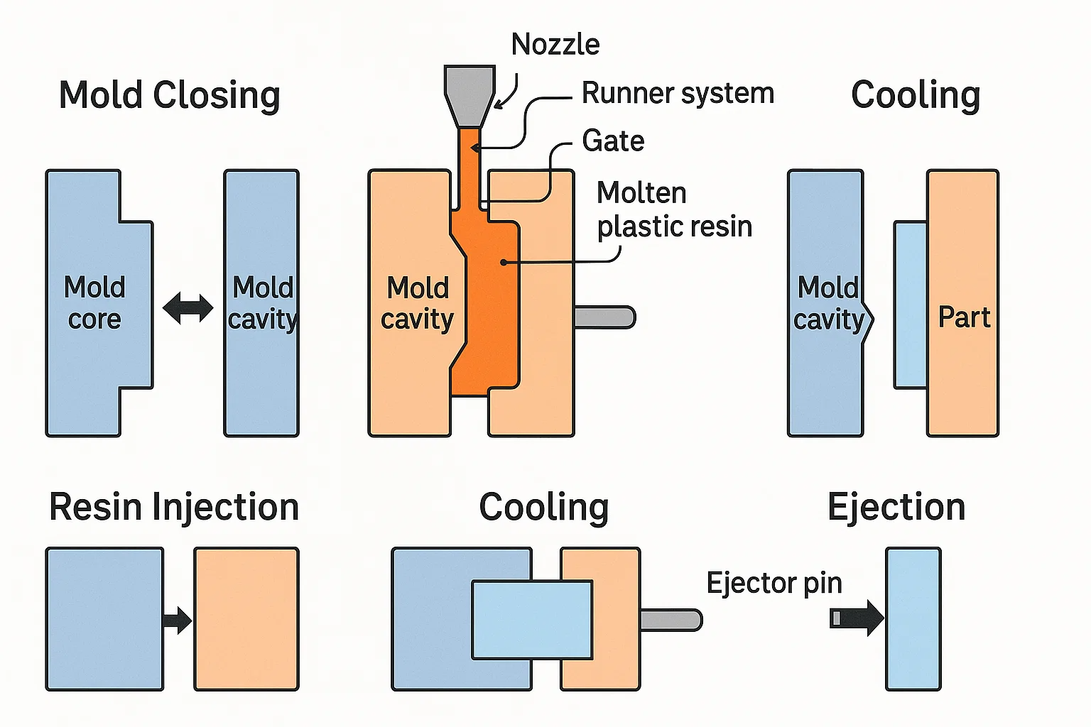 Инъекция смолы: Расплаванная пластиковая смола впрыскивается под высоким давлением через форсунку и в форму. Материал проходит через Система бегунов и ворота - который является частью половины полости - и заполняет пространство между ядром и полостью. Ядро вытесняет смолу, чтобы сформировать внутреннюю форму части, в то время как полость образует внешнюю оболочку.