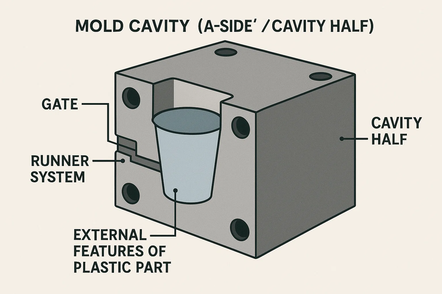 А полость плесени , также известный как «А-сторона» или «половина полости», является компонентом, который образует внешние функции пластической части. Это внешняя оболочка или контейнер, который заполняет расплавленный пластик. Используя аналогию пластиковой чашки, полость образует внешнюю часть чашки, включая ее губ и внешние стены.