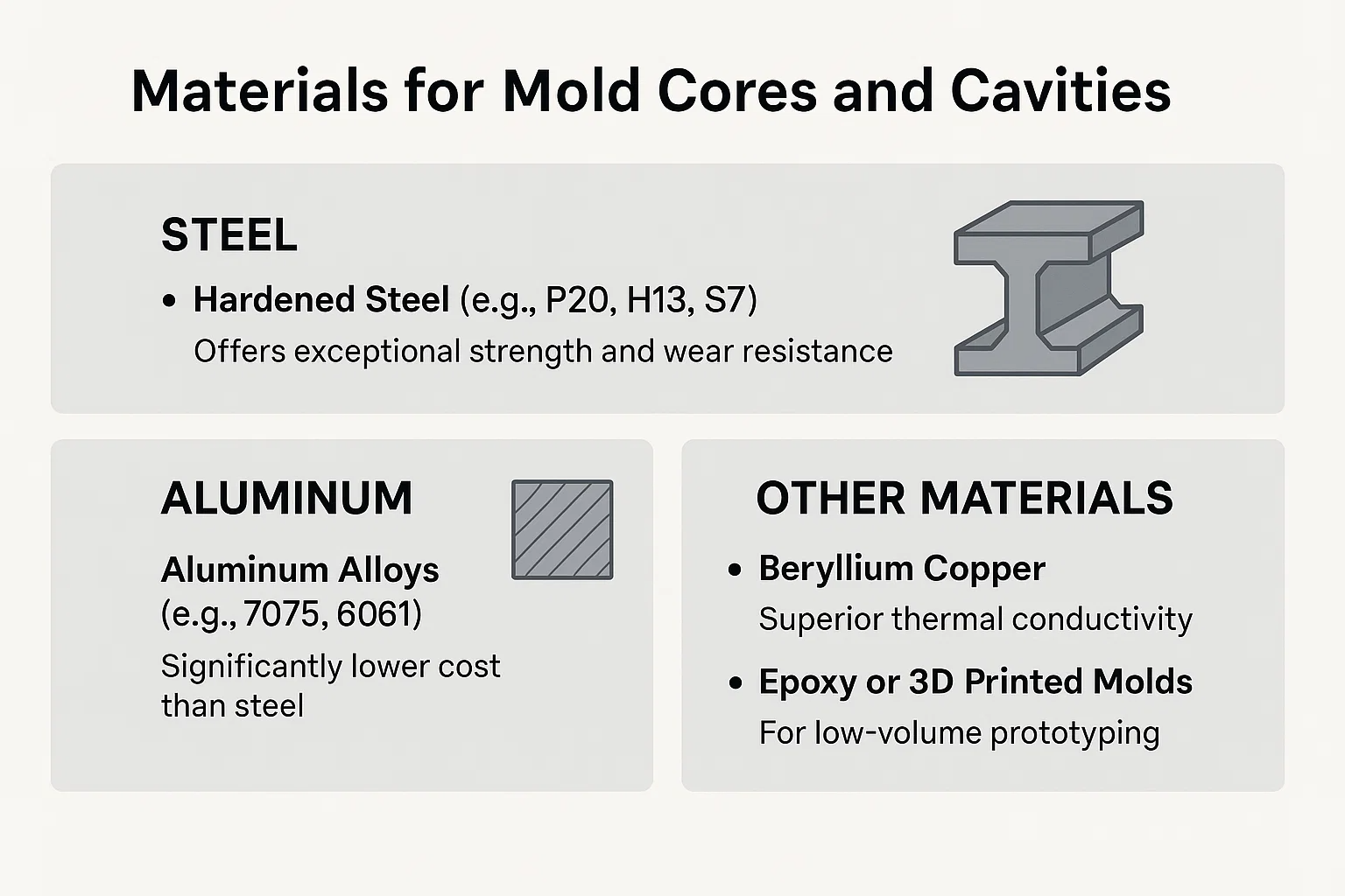 Алюминиевые сплавы (например, 7075, 6061) часто используются для прототипных форм или для производственных прогонов с низким объемом (обычно менее 100 000 частей).