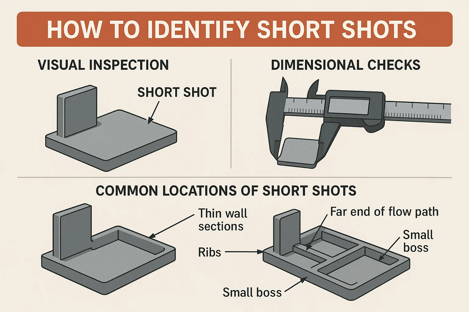 В то время как визуальная проверка часто достаточно, выполнение проверки размеров может предоставить более конкретную информацию, особенно для деталей со сложной геометрией. Если у вас есть часть, которая выглядит почти Завершите, но вы не уверены, измеряйте его длину, ширину и высоту. Короткий выстрел не сможет соответствовать необходимым размерам, так как часть не заполнила всю полость формы. Для запчастей с тонкими стенами короткий выстрел может быть не заметно очевиден поначалу, но проверка размерной работы подтвердит проблему.