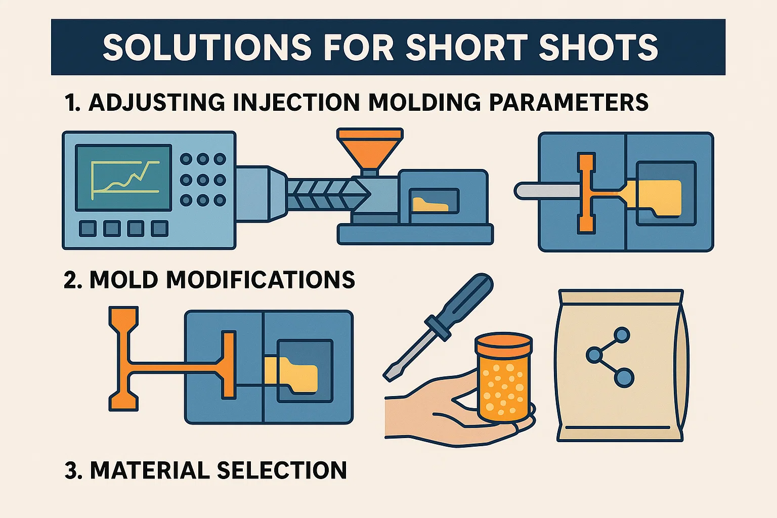 Решение короткого выстрела требует стратегического подхода. Часто лучше начать с самых простых и самых экономически эффективных решений, прежде чем перейти к более сложным и дорогим. Начните с настройки машины, затем рассмотрите материал и, наконец, посмотрите на саму плесень.